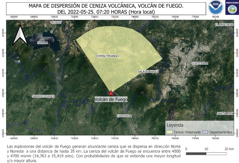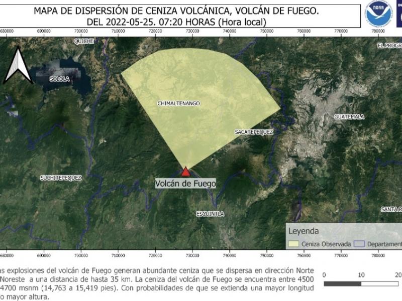 Por último, el INSIVUMEH indicó que, debido a la dirección del viento, se registró caída de ceniza sobre Parramos, La Soledad y la cabecera departamental de Chimaltenango. Existe la probabilidad de caída de ceniza sobre Antigua Guatemala, Ciudad Vieja y la zona metropolitana de la Ciudad de Guatemala, agregó el ente científico del Sistema CONRED.